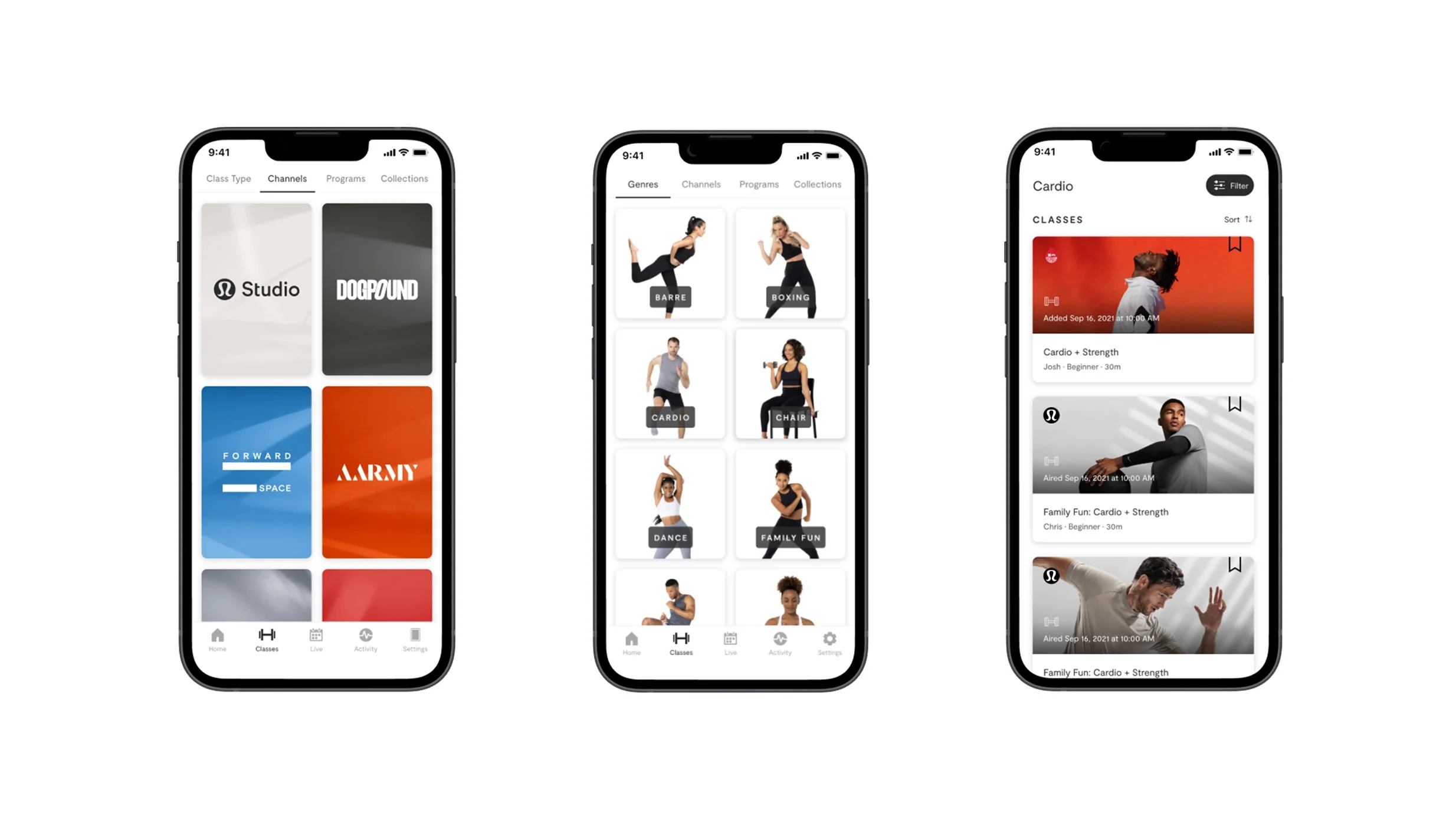 Working closely with our fitness content team, and our partner studios, we developed a design system of content cards that expressed the unique brand of each studio while maintaining a consistent look and feel in the app.